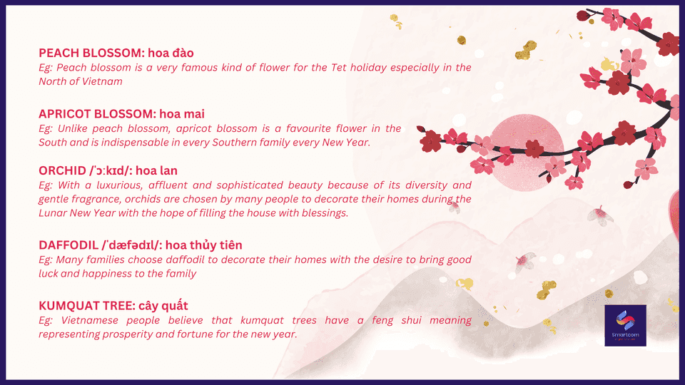 Vào mỗi dịp Tết đến xuân về, người ta thường trang trí nhà cửa và các toà nhà bằng những loại hoa và cây tượng trưng cho sự may mắn, phú quý và hạnh phúc. Dưới đây là 5 loại hoa phổ biến nhất vào mỗi dịp Tết Nguyên đán ở Việt Nam. Hoa đào, hoa mai, hoa lan, hoa thủy tiên và cây quất là những loài hoa và cây có ý nghĩa rất đặc biệt, mà mỗi loại lại có sự tích và ý nghĩa riêng.(For the Tet festival, it is customary to decorate houses and buildings with flowers and plants representing good fortune, wealth, and happiness. Here are the 5 most popular flowers on each Lunar New Year occasion in Vietnam. Peach blossom, apricot blossom, orchid, daffodil and kumquat tree are very special flowers and plants, each has its own story and meaning.)1. Peach blossom: Hoa đào Peach blossom is a very famous kind of flower for the Tet holiday especially in the North of Vietnam, as it can only be grown in the North and is commonly seen in the spring in the Lunar New Year. It is said to protect against devils and ghosts, as well as bring peace and calm into the host's family. Peach blossoms also symbolise good new beginnings, giving Vietnamese people hope for joy, wealth, and good fortune. (Hoa đào là một loại hoa nổi tiếng vào dịp Tết đặc biệt là ở miền Bắc Việt Nam vì nó chỉ có thể được trồng ở miền Bắc và thường được nhìn thấy vào mùa xuân trong dịp Tết nguyên đán. Nó được cho là có thể đuổi ma quỷ cũng như mang lại hoà bình và sự yên tĩnh cho gia đình chủ nhà. Hoa đào cũng là biểu tượng cho một khởi đầu mới tốt đẹp, mang đến cho người dân Việt Nam hy vọng về niềm vui, sự giàu có và may mắn)2. Apricot blossom: Hoa mai Unlike peach blossom, apricot blossom is a favourite flower in the South and is indispensable in every Southern family every New Year. The apricot tree is said to protect the owner from devils and evil spirits. Moreover, the common people believe that the more petals a family has, the luckier and more prosperous the house will be in the new year. The most common type of yellow apricot flower has 5 petals. They represent joy, longevity, wealth, good fortune, and beauty. (Khác với hoa đào, hoa mai là loại hoa được ưu thích ở miền Nam và không thể thiếu trong mỗi gia đình miền Nam vào mỗi dịp Tết đến. Cây hoa mai được cho là bảo vệ gia chủ khỏi ma quỷ và điềm xấu. Hơn thế, dân gian quan niệm rằng gia đình nào có hoa mai nở càng nhiều cánh thì nhà đó càng may mắn và sung túc trong năm mới. Loại hoa mai phổ biến nhất có 5 cánh hoa, chúng tượng trưng cho niềm vui, sự trường thọ, sự giàu có, may mắn và sắc đẹp)3. Orchid /ˈɔːkɪd/: Hoa lan Mang vẻ đẹp sang trọng, giàu có và tinh tế bởi sự đa dạng và hương thơm nhẹ nhàng, hoa lan được nhiều người lựa chọn để trang trí nhà cửa trong dịp Tết nguyên đán với mong muốn phúc lộc đầy nhà. Hoa lan có nhiều chủng loại và màu sắc khác nhau với những nét đặc trưng và ý nghĩa nghĩa riêng biệt tạo nên sự độc đáo của loài hoa này. Hoa lan màu trắng đại diện cho sự tôn kính và khiêm nhường, thanh thuần và sắc đẹp; màu vàng tượng trưng cho sự thành công, tình bạn và khởi đầu mới; màu tím biểu tượng cho sự chung thuỷ, ngưỡng mộ và tôn trọng. (With a luxurious, affluent and sophisticated beauty because of its diversity and gentle fragrance, orchids are chosen by many people to decorate their homes during the Lunar New Year with the hope of filling the house with blessings. Orchids have many different types and colours with distinct features and meanings that make up the uniqueness of this flower. White orchids represent reverence and humility, purity and beauty; yellow symbolises success, friendship and new beginnings; purple symbolises loyalty, admiration and respect.)4. Daffodil /ˈdæfədɪl/: Hoa thủy tiên Một loại cây màu vàng tươi, có tâm hình hoa loa kèn, một loài hoa đặc trưng của mùa xuân và biểu tượng cho sự may mắn. Rất nhiều gia đình chọn hoa thủy tiên để trang trí nhà cửa với mong muốn mang lại sự may mắn và hạnh phúc cho gia đình. (A bulbous plant that typically bears bright yellow flowers with a long trumpet-shaped core, a typical flower of spring and a symbol of good luck.)5. Kumquat tree: cây quất Cây quất cho ra quả quanh năm nhưng nhiều hơn vào những ngày Tết, người Việt Nam quan niệm rằng cây quất mang ý nghĩa phong thuỷ đại diện cho sự sung túc và may mắn cho trong năm mới. Một chậu cây quất có lá xanh tốt và nhiều quả thể hiện sự bình an, hứa hẹn một năm mới tốt đẹp và thịnh vượng. Những cây quất có quả màu vàng cam thường được trang trí bằng những đồ vật có màu đỏ hoặc vàng để tạo sự nổi bật cho cây. (Kumquat trees fructify all year round but more often in Tet holidays, Vietnamese people believe that kumquat trees have a feng shui meaning representing prosperity and fortune for the new year. A pot of kumquat tree with lush green leaves and many fruits represents peace, promising a good and prosperous new year. Kumquat trees with orange-yellow fruits are often decorated with red or yellow objects to make the tree stand out.)