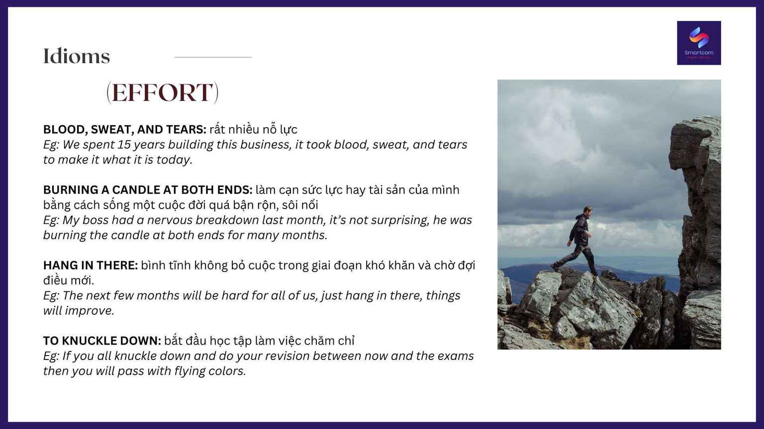 Ngoài ra còn rất nhiều các Idioms khác mà các bạn có thể sử dụng để diễn đạt sự nỗ lực. Blood, sweat, and tears: rất nhiều nỗ lựcEg: We spent 15 years building this business, it took blood, sweat, and tears to make it what it is today.(Chúng tôi đã dành 15 năm để xây dựng doanh nghiệp này, nó đã đổ máu, mồ hôi và nước mắt để có được như ngày hôm nay). Burning a candle at both ends: làm cạn sức lực hay tài sản của mình bằng cách sống một cuộc đời quá bận rộn, sôi nổiEg: My boss had a nervous breakdown last month, it’s not surprising, he was burning the candle at both ends for many months.(Sếp của tôi đã bị suy nhược thần kinh vào tháng trước, không có gì đáng ngạc nhiên, ông ấy đã đốt cháy cả hai ngọn nến trong nhiều tháng). Hang in there: bình tĩnh không bỏ cuộc trong giai đoạn khó khăn và chờ đợi điều mới. Eg: The next few months will be hard for all of us, just hang in there, things will improve.(Vài tháng tới sẽ khó khăn cho tất cả chúng ta, chỉ cần chờ đợi, mọi thứ sẽ được cải thiện). To knuckle down: bắt đầu học tập làm việc chăm chỉEg: If you all knuckle down and do your revision between now and the exams then you will pass with flying colors.(Nếu tất cả các bạn đều cố gắng ôn tập từ giờ cho đến kỳ thi thì bạn sẽ vượt qua một cách xuất sắc).