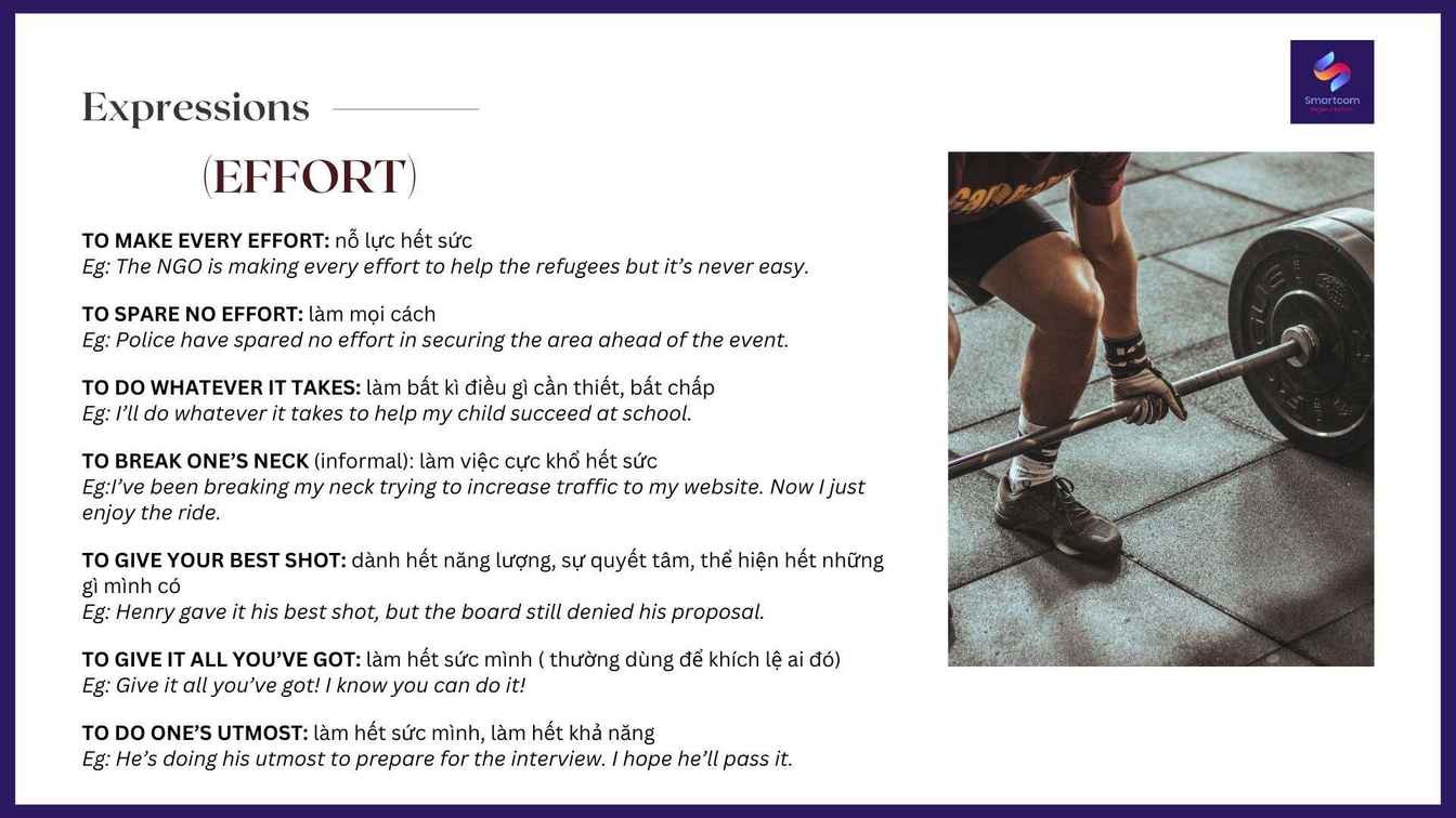 Nói về cố gắng hay nỗ lực, thì tiếng Anh có nhiều cách diễn đạt chẳng thua kém gì tiếng Việt. Smartcom English sẽ chia sẻ với các bạn các cách nói về sự nỗ lực khác nhau trong tiếng Anh, giúp làm phong phú vốn diễn đạt của các bạn nhé:Để nói mình sẽ dốc hết sức ra làm việc gì, bạn sử dụng cụm từ GIVE SOMETHING YOUR ALL. Nhưng nói mình cố hết sức theo cách của riêng mình thì bạn có thể dùng cụm từ GO OUT OF YOUR WAY TO DO SOMETHING. Nếu muốn nói ai đó sẽ đảm nhận trách nhiệm (thường là việc lớn hoặc khó khăn) thì mình có thể nói người đó "kéo tạ" với cụm từ PULL YOUR WEIGHT. Để nói ai đó nỗ lực không ngừng nghỉ thì mình có thể dùng cụm từ PULL OUT ALL THE STOPS. Và cuối cùng là nếu bạn muốn nói cố gắng bằng mọi cách (tích cực hay tiêu cực) để đạt được mục tiêu thì bạn nên dùng cụm từ BY HOOK OR BY CROOK. Idioms with effort