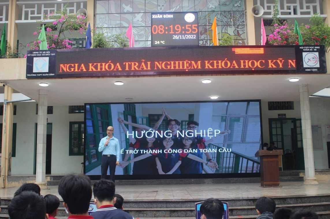(Thầy Nguyễn Anh Đức trong buổi nói chuyện Hướng nghiệp cho hàng trăm em học sinh trường THPT Xuân Đỉnh)