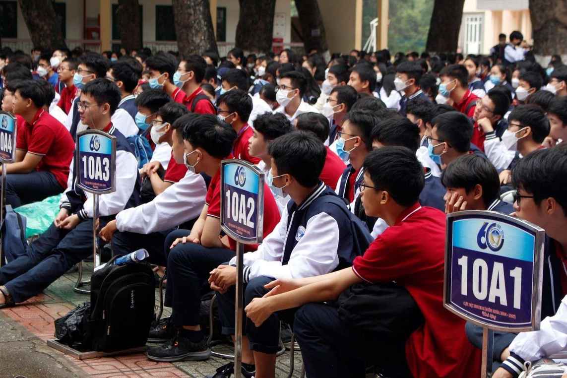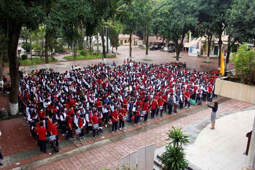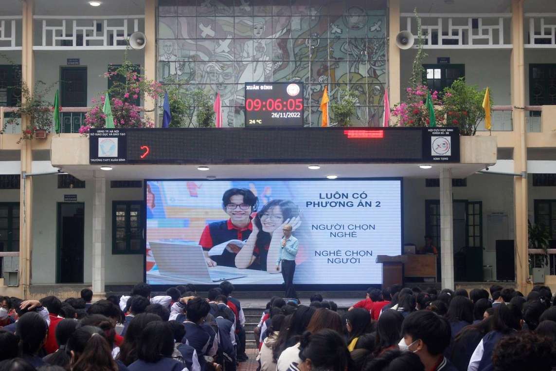 (Hàng trăm em học sinh tề tựu ở ngôi trường THPT Xuân Đỉnh đã có hơn 60 năm tuổi đời để tham gia buổi nói chuyện Hướng Nghiệp đầy khí thế)