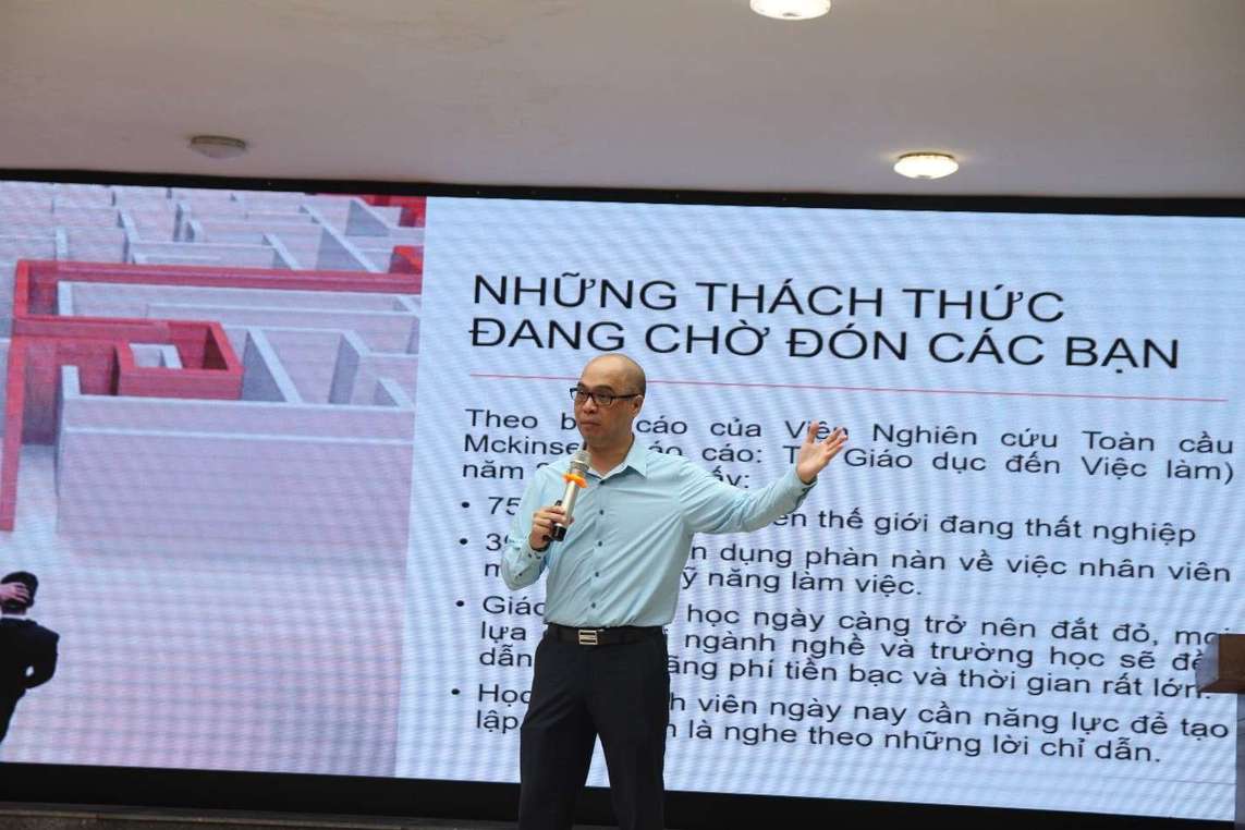 Sau những phút làm nóng bằng những màn chào hỏi và đối đáp vui vẻ, diễn giả, thầy giáo Nguyễn Anh Đức đã cung cấp cho các em học sinh một thực tế không phải là màu hồng như những suy nghĩ non nớt của các em đang mong đợi, mà đó là những con số thống kê gây sốc cho các em từ Viện Nghiên cứu Toàn cầu danh tiếng Mckinsey trích từ báo cáo “From Education to Employment” như: