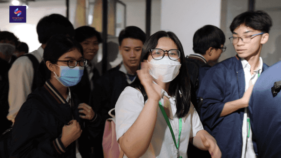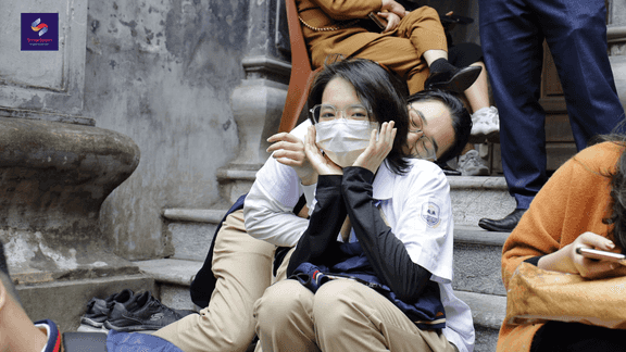 (Các em học sinh THPT Mỹ Đình hào hứng đón chờ buổi học thực tế tại Phố Cổ)