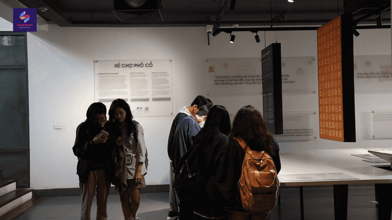 (Các em học sinh chia thành từng nhóm để tìm hiểu về nội dung được trưng bày tại Trung Tâm Giao Lưu Văn Hóa Phố Cổ - 50 Đào Duy Từ)