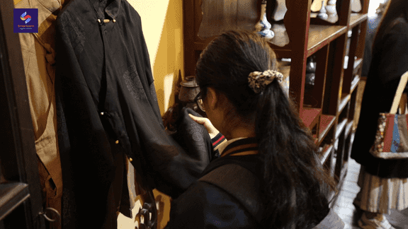 (Em học sinh chăm chú xem các chi tiết trên bộ Việt Phục được trưng bày tại Nhà Cổ)