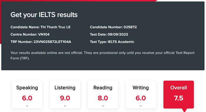 Mặc dù khởi điểm đều ở trình độ Cơ bản, từ 3.5-4.0 Ielts. Tuy nhiên, các em hiện tại đã đạt đến mức điểm 7.5 đến 8.0 trong kỳ thi IELTS tại IDP tháng 9/2023 chỉ sau 1 năm học, tạo ưu thế tuyệt đối cho việc ứng tuyển vào trường đại học top đầu: