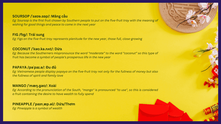 “Cầu sung vừa đủ xài…”Đó là những loại quả (mãng cầu, dừa, đu đủ, xoài) có phát âm (theo cách nói của người miền Nam) gần với ước nguyện đơn giản của người dân Việt Nam. Như một quan niệm để mọi thứ trở nên sinh sôi, nảy nở, người Việt cúng Tết bằng mâm ngũ quả: vừa mang ý nghĩa tâm linh, vừa để trang trí. (Phải nói thêm rằng người Việt bày 5 loại quả - ngũ quả - là theo quan niệm nhân sinh: sinh - lão - bệnh - tử, nên số 5 là lặp lại một vòng mới ứng vào số 1 (sinh) trong 4 giai đoạn nêu trên).Do điều kiện địa lý tự nhiên có sự khác biệt và thay đổi theo vùng miền nên mâm ngũ quả cũng được trình bày với các loại quả và hình thức khác nhau, nhưng căn bản thì người ta thường bày biện: Mãng cầu, Sung, Dừa, Đu đủ, Xoài, Dứa với những ý nghĩa cụ thể như bài học từ vựng về mâm ngũ quả dưới đây:(Those are the fruits (soursop, coconut, papaya, mango) which pronunciation (in Southern) is close to the simple wish of the Vietnamese people. As a conception for everything to become fruitful and flourish, Vietnamese people worship with a tray of five fruits: both for spiritual purpose and for decoration. (In addition, the Vietnamese display 5 types of fruits - five fruits - according to the concept of life: birth - old age - illness - death, so the number 5 is repeated a new round corresponding to the number 1 (birth) in 4 stages above. Because the natural geographical conditions are different and vary by region, the five-fruit tray is also presented with different types of fruits and forms, but basically, people usually display: Soursop, Fig, Coconut, Papaya, Mango, Pineapple with concrete meanings such as the vocabulary lesson about the five-fruit tray below.)1. Soursop /ˈsaʊə.sɒp/: Mãng cầu Mãng cầu là loại quả đầu tiên được người dân miền Nam chọn để chưng vào mâm ngũ quả với ý nghĩa cầu mong những điều tốt đẹp, bình yên sẽ đến trong năm mới. Lớp da nở căng và xanh bóng tượng trưng cho sự đủ đầy, giúp gia chủ có thêm tài lộc trong năm tới. (Soursop is the first fruit chosen by Southern people to put on the five-fruit tray with the meaning of wishing for good things and peace to come in the next year. The glossy green and blooming skin symbolized fullness, helping the homeowners to have more fortune in the coming year.)2. Fig /fɪɡ/: Trái sung Trái sung trên mâm ngũ quả thể hiện sự sung túc cho năm mới, những trái sung tròn đầy, mọc ken chặt mang ý nghĩa gắn kết, ấm no cho gia đình. (Figs on the five-fruit tray represents plenitude for the new year, those full, close-growing figs mean close-knit and warmth for the family.)3. Coconut /ˈkəʊ.kə.nʌt/: Dừa Do người miền Nam phát âm sai từ “vừa” thành từ “dừa” nên loại quả này đã trở thành biểu tượng cho cuộc sống ấm no, viễn mãn của người dân trong năm mới tốt đẹp (Because the Southerners mispronounce the word “moderate” to the word “coconut” so this type of fruit has become a symbol of people’s prosperous life in the new year.) 4. Papaya /pəˈpaɪ.ə/: Đu đủ Tên của loại quả này trong tiếng việt mang ý nghĩa sung túc, đủ đầy, không thừa cũng không thiếu. Người Việt trưng loại quả này lên mâm ngũ quả không chỉ mong muốn sự đầy đủ về tiền tài mà còn sự đong đầy về tinh thần, tình cảm gia đình (The name of this fruit in Vietnamese means fullness, prosperity, neither too much nor too little. Vietnamese people display papaya on the five-fruit tray not only for the fullness of money but also the fullness of spirit and family love.)5. Mango /ˈmæŋ.ɡəʊ/: Xoài Theo phát âm của miền Nam, “xoài” được phát âm là “xài” nên đây được xem là loại quả chứa đựng niềm mong mỏi của người dân muốn có được của cải để tiêu xài được đầy đủ. Hay cao sang hơn, đó là cuộc sống dư giả, tiêu xài không lo không nghĩ. (According to the pronunciation of the South, "mango" is pronounced "to use", so this is considered a fruit containing the desire to have wealth to fully spend. Or is it more luxurious, it's a life of abundance, spending without worrying.)6. Pineapple /ˈpaɪnˌæp.əl/: Dứa/Thơm Trái dứa biểu tượng cho sự giàu có. Không chỉ vậy, trong tiếng Hoa, từ “dứa” được phát âm gần giống với âm của chữ “may mắn đến theo cách của bạn”. Chính vì vậy, dứa rất phổ biến với ý nghĩa mang lại sự giàu có, may mắn và thịnh vượng. (Pineapple is a symbol of wealth. Moreover, in Chinese, the word pineapple is pronounced similar to the sound of the word "luck comes your way". Therefore, pineapple is very popular with the meaning of bringing wealth, luck and prosperity.)