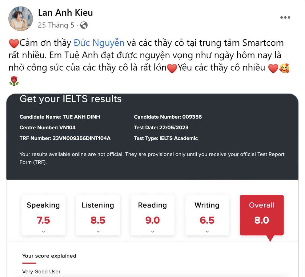 (Hình ảnh lớp học IELTS 5 sao và những lời cảm ơn xúc động của phụ huynh có con đạt IELTS 8.0 sau 1 khóa học duy nhất tại Smartcom)