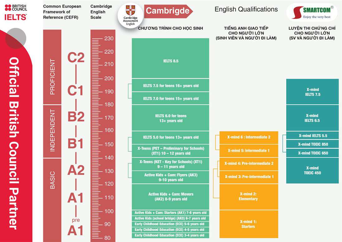 - Đào tạo theo chuẩn Cambridge với các trình độ từ Starters (A0), Movers (A1), Flyers (A2 – tuổi thiếu nhi), KET (A2 – tuổi thiếu niên), PET (B1), đến FCE (B2).