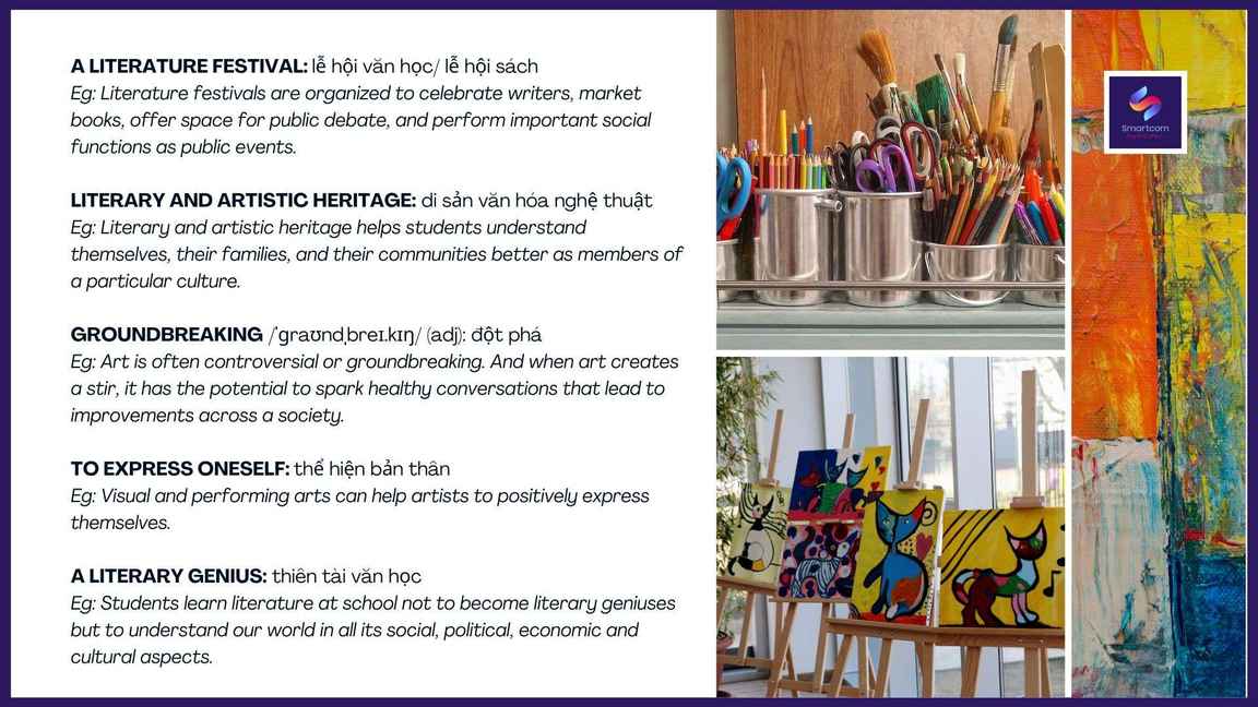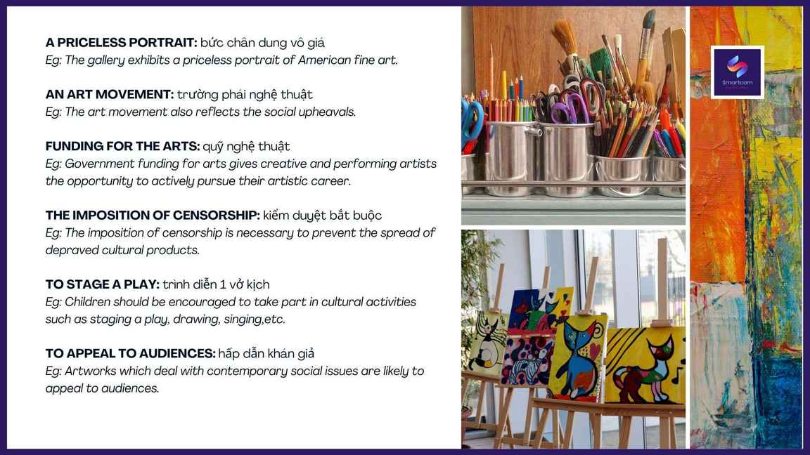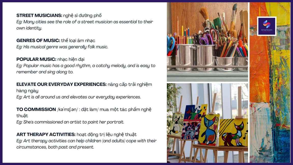 Nghệ thuật ở xung quanh chúng ta và tác động rất lớn đến không chỉ đời sống tinh thần của mỗi cá nhân mà còn có tác động to lớn đến kinh tế xã hội. Vậy Smartcom English sẽ mang đến cho bạn những từ vựng liên quan đến chủ đề để chúng ta có thể tự tin nói về những nét đẹp và sự ảnh hưởng của nghệ thuật.
