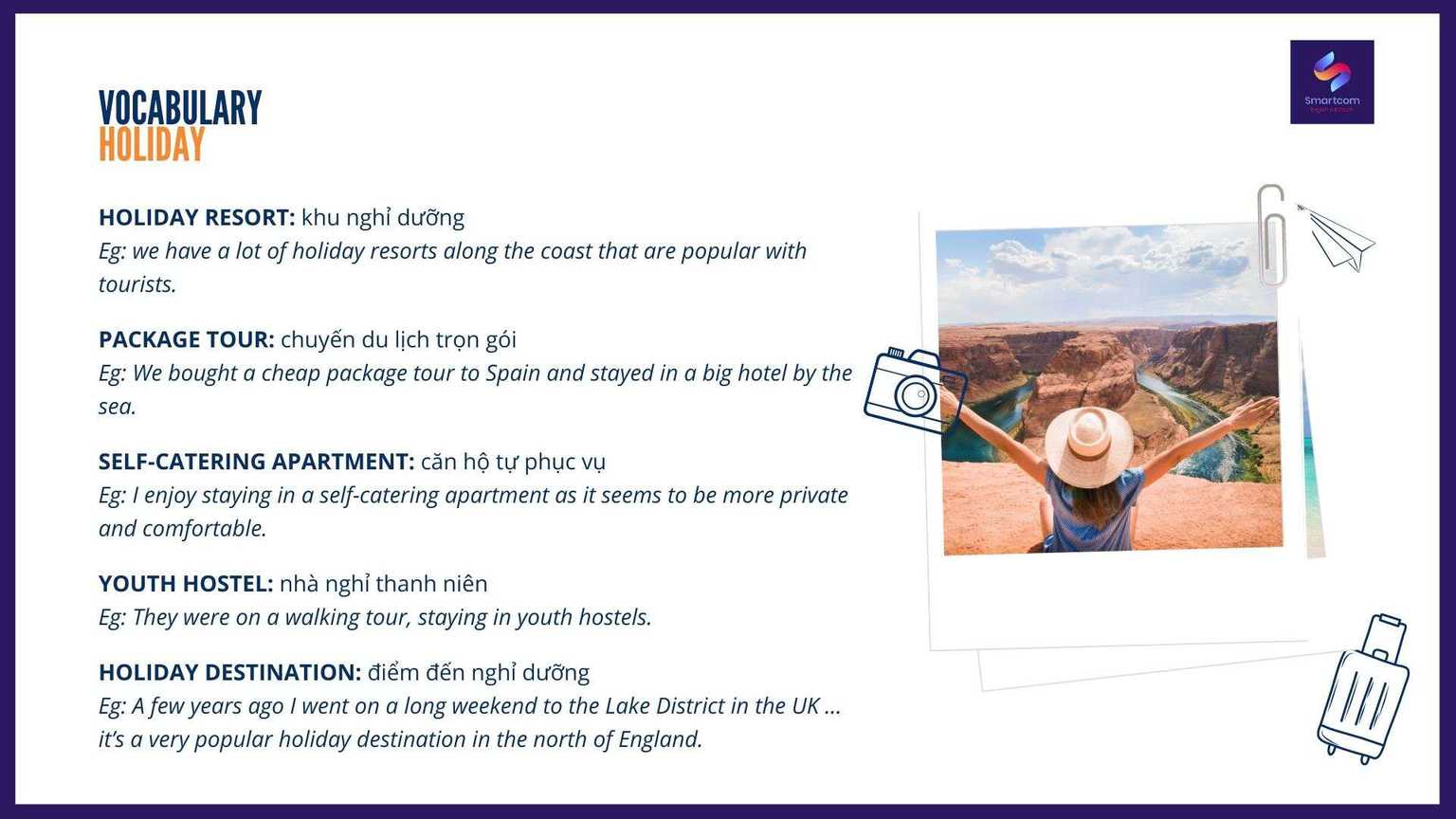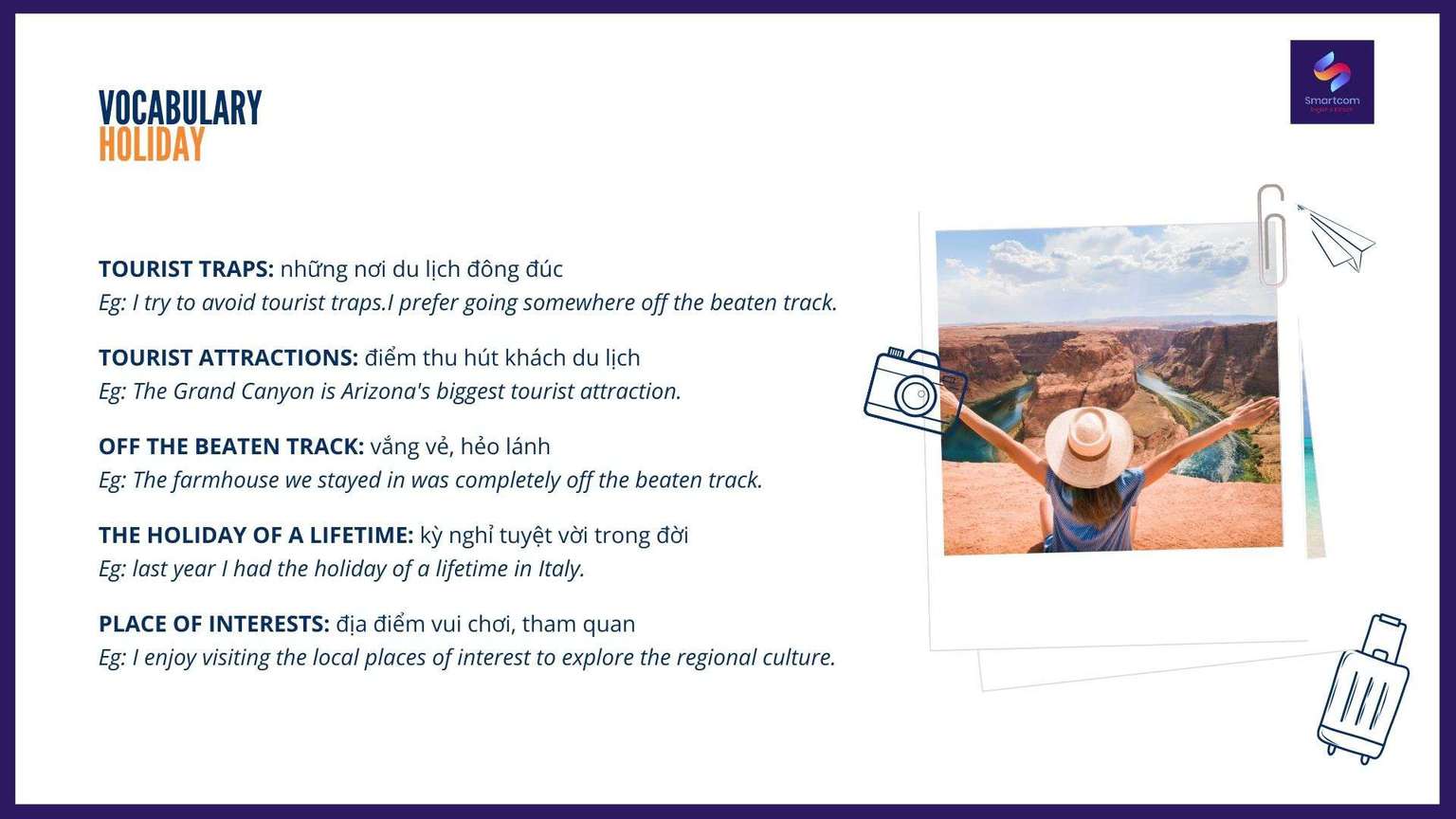 Với những từ vựng trên đây, Smartcom English hi vọng các bạn đã có thêm tự tin với chủ đề Holiday trong bài thi IELTS. Chúc các bạn ôn luyện thật tốt và đạt được mục tiêu. Và đừng quên theo dõi Smartcom English thường xuyên để cập nhật thêm những từ vựng và kiến thức Tiếng Anh hữu ích nhé!.