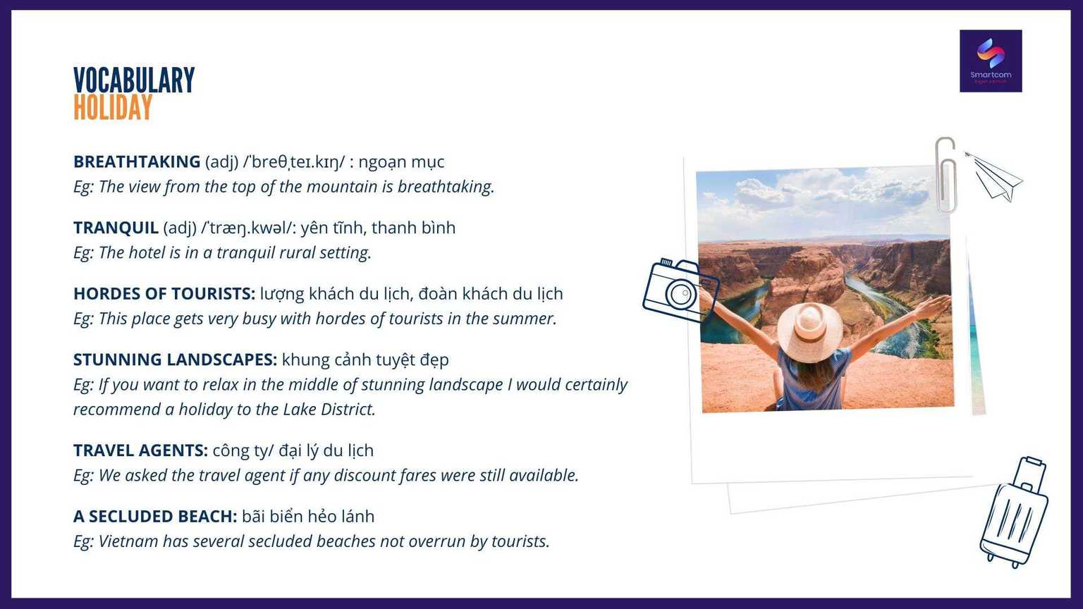 Breathtaking (adj) /ˈbreθˌteɪ.kɪŋ/ : ngoạn mụcEg: The view from the top of the mountain is breathtaking.(Khung cảnh nhìn từ đỉnh núi thật ngoạn mục). Tranquil (adj) /ˈtræŋ.kwəl/: yên tĩnh, thanh bìnhEg: The hotel is in a tranquil rural setting.(Khách sạn nằm trong một khung cảnh nông thôn yên tĩnh). Hordes of tourists: lượng khách du lịch, đoàn khách du lịchEg: This place gets very busy with hordes of tourists in the summer.(Nơi này trở nên rất đông đúc với lượng khách du lịch vào mùa hè). Stunning landscapes: khung cảnh tuyệt đẹpEg: If you want to relax in the middle of stunning landscape I would certainly recommend a holiday to the Lake District.(Nếu bạn muốn thư giãn giữa khung cảnh tuyệt đẹp, tôi chắc chắn sẽ giới thiệu một kỳ nghỉ tới Lake District). Travel agents: công ty/ đại lý du lịchEg: We asked the travel agent if any discount fares were still available.(Chúng tôi đã hỏi đại lý du lịch xem còn vé giảm giá nào không). A secluded beach: bãi biển hẻo lánhEg: Vietnam has several secluded beaches not overrun by tourists.(Việt Nam có một số bãi biển hẻo lánh chưa bị tàn phá bởi khách du lịch.