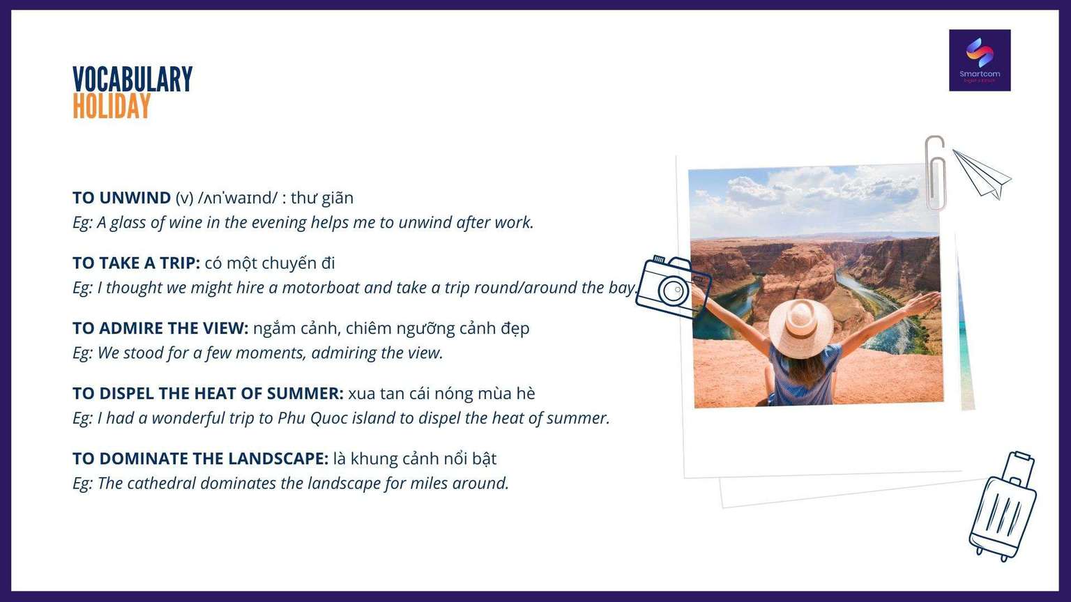 To unwind (v) /ʌnˈwaɪnd/ : thư giãnEg: A glass of wine in the evening helps me to unwind after work.(Một ly rượu vào buổi tối giúp tôi thư giãn sau giờ làm việc). To take a trip: có một chuyến điEg: I thought we might hire a motorboat and take a trip round/around the bay.(Tôi nghĩ chúng ta có thể thuê một chiếc thuyền máy và đi một vòng quanh vịnh). To admire the view: ngắm cảnh, chiêm ngưỡng cảnh đẹpEg: We stood for a few moments, admiring the view.(Chúng tôi đứng một lúc, ngắm cảnh). To dispel the heat of summer: xua tan cái nóng mùa hèEg: I had a wonderful trip to Phu Quoc island to dispel the heat of summer.(Tôi đã có một chuyến đi tuyệt vời đến đảo Phú Quốc để xua tan cái nóng của mùa hè). To dominate the landscape: là khung cảnh nổi bật Eg: The cathedral dominates the landscape for miles around.(Nhà thờ là cảnh quan nổi bật trong vài dặm).