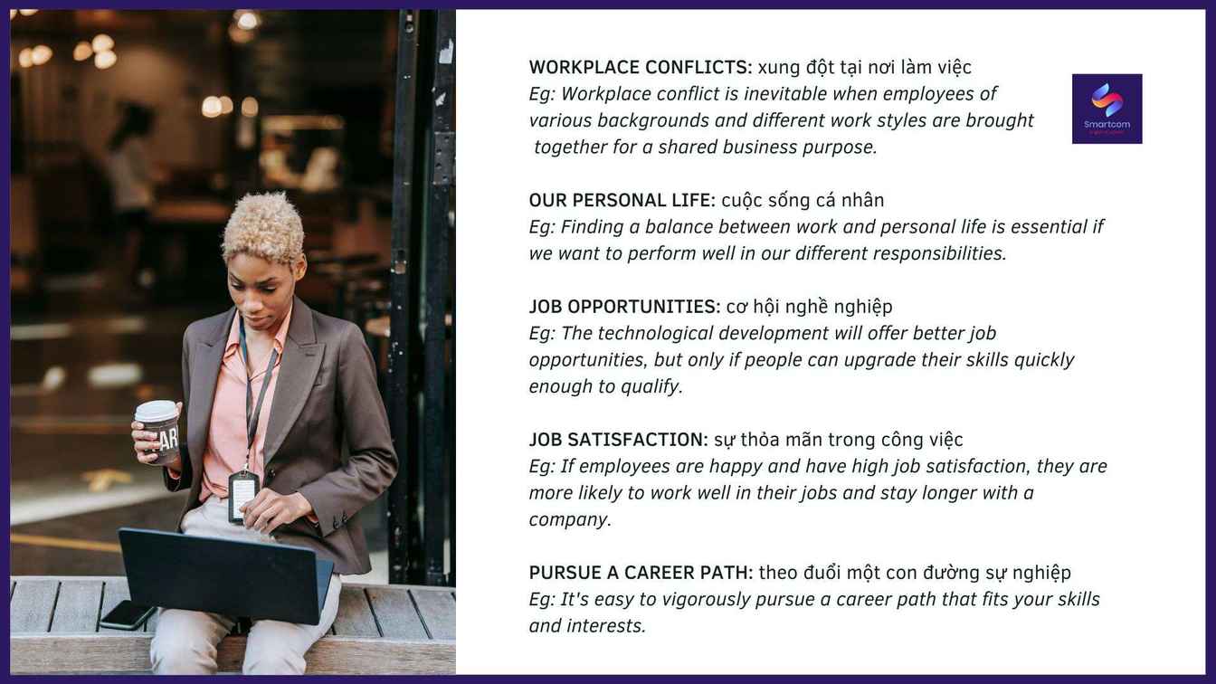 Favorable work environment: môi trường làm việc thuận lợi. Eg: A favorable work environment is a workplace that promotes employee safety, growth and goal attainment. (Môi trường làm việc thuận lợi là nơi làm việc thúc đẩy sự an toàn, sự phát triển và việc đạt được mục tiêu của nhân viên). Workplace conflicts: xung đột tại nơi làm việc. Eg: Workplace conflict is inevitable when employees of various backgrounds and different work styles are brought together for a shared business purpose. (Xung đột tại nơi làm việc là không thể tránh khỏi khi các nhân viên thuộc nhiều nền tảng và phong cách làm việc khác nhau được tập hợp lại vì mục đích công việc chung).