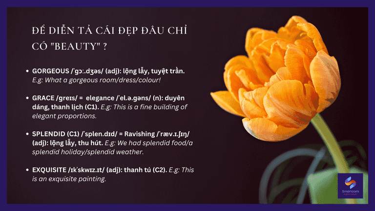 Để vốn từ vựng không bao giờ trở thành nguyên nhân giới hạn tư duy và sáng tạo khi chúng ta sử dụng ngôn ngữ thì việc tiếp nạp thêm các từ mới có cùng chủ đề là một điều không thể thiếu. Ngoài từ "beauty", bạn có thể sử dụng một số từ vựng beauty khác độc đáo hơn, cao cấp hơn để thể hiện khả năng ngoại ngữ của mình.“For women, never miss an opportunity to tell them they’re beautiful” - Đối với phụ nữ, đừng bao giờ bỏ lỡ cơ hội khen họ đẹp.Thật vậy, lời khen luôn là vũ khí để gây ấn tượng đối với phái nữ. Tuy nhiên lời khen cũng cần được nói đúng thời điểm, tình huống và quan trọng hơn cả đó là sự chân thành. Để tạo được ấn tượng tốt, chúng ta nên trang bị đầy đủ vũ khí để có thể tận dụng trong tình huống phù hợp nhé.Hôm nay, bài học về Những từ vựng miêu tả vẻ đẹp không những sẽ giúp bạn lên trình tiếng Anh mà còn giúp bạn khiến “crush” rung rinh đấy!Chắc hẳn, có đôi lần sự chú ý của bạn lỡ va vào một cô gái vô cùng tinh khôi, xinh đẹp, khi đó ta sẽ thốt lên: “My God, you’re GORGEOUS” - Chúa ơi, Em thật là LỘNG LẪY!Hoặc biến hoá câu văn chút xíu, là có ngay lời khen mỹ miều “You look drop dead GORGEOUS” - Em trông ĐẸP ĐẾN NAO LÒNG”.Tuy nhiên, nếu muốn sử dụng từ cao cấp hơn, thì ta dùng “SPLENDID”, hoặc “RAVISHING” – “You look SPLENDID/RAVISHING in that outfit”.Còn khi ta mê cái vẻ yêu kiều, duyên dáng của cô nàng, thì ta sẽ dùng từ “GRACEFUL”, “ELEGANT” hoặc “CHARMING”. Biến đổi từ loại sang danh từ, ta có ngay lời nhận xét: “She has natural GRACE and ELEGANCE”.Tương tự, nếu muốn nhấn mạnh vẻ đẹp thanh tú, ta có thể dùng từ “EXQUISITE”. Cuối cùng, dù có là vẻ đẹp gì đi chăng nữa, thì đều khiến ta “can’t take my eyes off of you” - không thể rời mắt được đúng không? Và sự thực là, “The beauty is in the eye of the beholder” - Vẻ đẹp không phải ở đôi má hồng của người thiếu nữ mà nằm trong đôi mắt của kẻ si tình.” Điều đặc biệt ở đây là tất cả những từ vựng trên đều có thể được dùng với cả đồ vật. Bạn hãy xem hình ảnh để cùng học các ví dụ nhé!