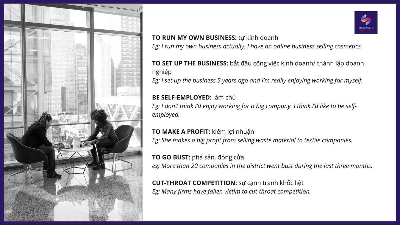 To run my own business: tự kinh doanhEg: I run my own business actually. I have an online business selling cosmetics.(Tôi tự kinh doanh. Tôi kinh doanh mỹ phẩm online). To set up the business: bắt đầu công việc kinh doanh/ thành lập doanh nghiệpEg: I set up the business 5 years ago and I’m really enjoying working for myself.(Tôi thành lập doanh nghiệp cách đây 5 năm và tôi thực sự thích tự kinh doanh). Be self-employed: làm chủEg: I don’t think I’d enjoy working for a big company. I think I’d like to be self-employed.(Tôi không nghĩ mình thích làm việc cho một công ty lớn. Tôi nghĩ rằng tôi muốn được tự làm chủ). To make a profit: kiếm lợi nhuậnEg: She makes a big profit from selling waste material to textile companies.(Cô kiếm được lợi nhuận lớn từ việc bán phế liệu cho các công ty dệt may). To go bust: phá sản, đóng cửaeg: More than 20 companies in the district went bust during the last three months.(Hơn 20 công ty trong huyện đã phá sản trong ba tháng qua). Cut-throat competition: sự cạnh tranh khốc liệtEg: Many firms have fallen victim to cut-throat competition.(Nhiều công ty đã trở thành nạn nhân của sự cạnh tranh khốc liệt).