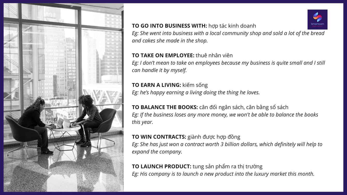 To go into business with: hợp tác kinh doanhEg: She went into business with a local community shop and sold a lot of the bread and cakes she made in the shop.(Cô bắt đầu hợp tác kinh doanh với một cửa hàng cộng đồng địa phương và bán được rất nhiều bánh mì và bánh ngọt do cô làm trong cửa hàng). To take on employee: thuê nhân viênEg: I don’t mean to take on employees because my business is quite small and I still can handle it by myself. (Tôi không có ý nhận nhân viên vì doanh nghiệp của tôi khá nhỏ và một mình tôi vẫn có thể xử lý được). To earn a living: kiếm sốngEg: he’s happy earning a living doing the thing he loves.(Anh ấy hạnh phúc khi kiếm sống bằng công việc anh ấy yêu thích). To balance the books: cân đối ngân sách, cân bằng sổ sáchEg: If the business loses any more money, we won't be able to balance the books this year.(Nếu doanh nghiệp thua lỗ thêm nữa, chúng tôi sẽ không thể cân bằng sổ sách trong năm nay). To win contracts: giành được hợp đồngEg: She has just won a contract worth 3 billion dollars, which definitely will help to expand the company. (Cô ấy vừa giành được một hợp đồng trị giá 3 tỷ đô la, điều này chắc chắn sẽ giúp mở rộng công ty). To launch product: tung sản phẩm ra thị trườngEg: His company is to launch a new product into the luxury market this month. (Công ty của anh ấy sẽ tung ra một sản phẩm mới vào thị trường xa xỉ trong tháng này).