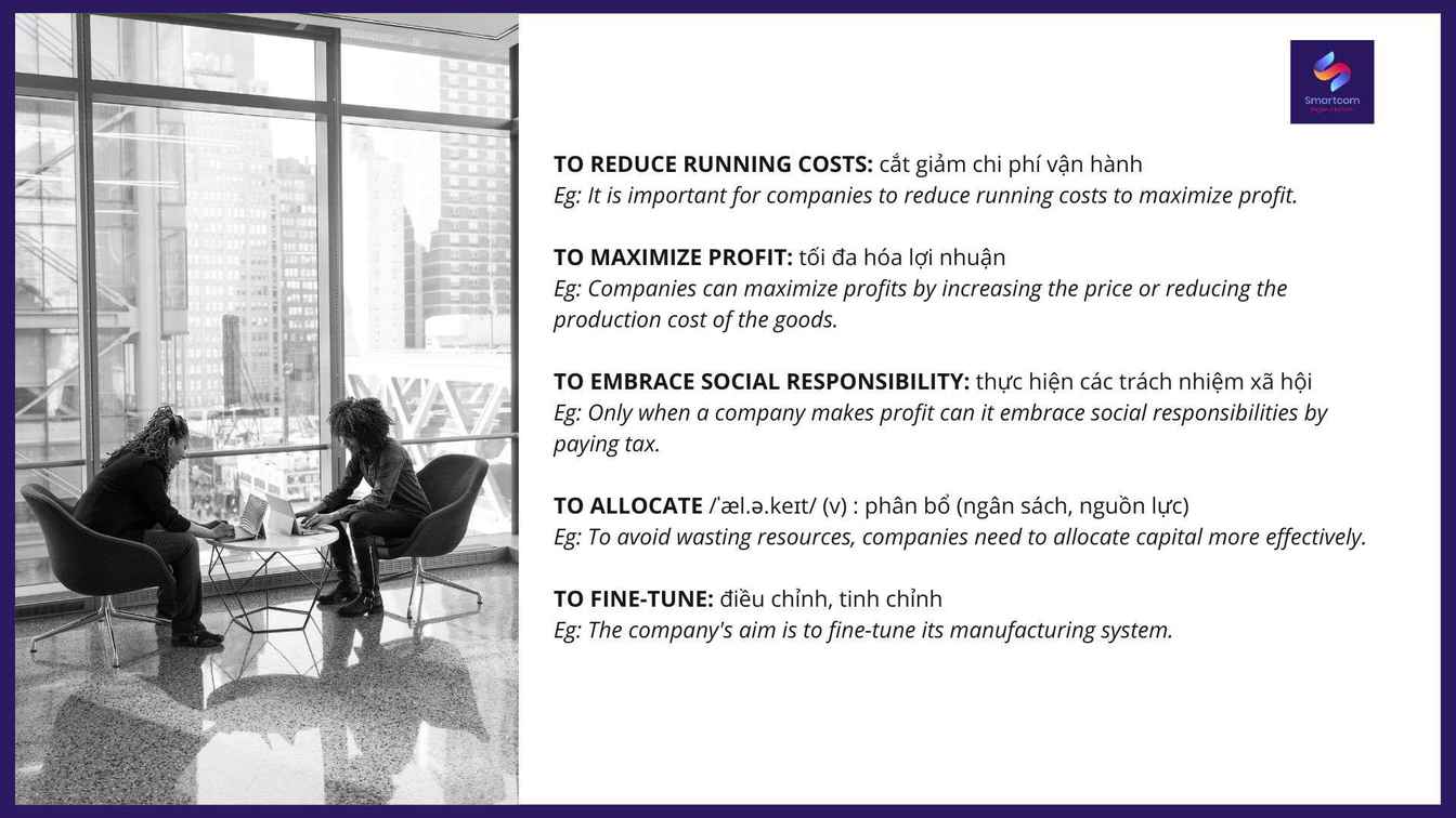 To reduce running costs: cắt giảm chi phí vận hànhEg: It is important for companies to reduce running costs to maximize profit.(Điều quan trọng đối với các công ty là giảm chi phí vận hành để tối đa hóa lợi nhuận). To maximize profit: tối đa hóa lợi nhuậnEg: Companies can maximize profits by increasing the price or reducing the production cost of the goods.(Các công ty có thể tối đa hóa lợi nhuận bằng cách tăng giá hoặc giảm chi phí sản xuất hàng hóa). To embrace social responsibility: thực hiện các trách nhiệm xã hộiEg: Only when a company makes profit can it embrace social responsibilities by paying tax. (Chỉ khi một công ty kiếm được lợi nhuận, nó mới có thể thực hiện các trách nhiệm xã hội bằng cách nộp thuế). To allocate /ˈæl.ə.keɪt/ (v) : phân bổ (ngân sách, nguồn lực) Eg: To avoid wasting resources, companies need to allocate capital more effectively.(Để tránh lãng phí nguồn lực, các công ty cần phân bổ vốn hiệu quả hơn). To fine-tune: điều chỉnh, tinh chỉnhEg: The company's aim is to fine-tune its manufacturing system.(Mục đích của công ty là tinh chỉnh hệ thống sản xuất của mình).