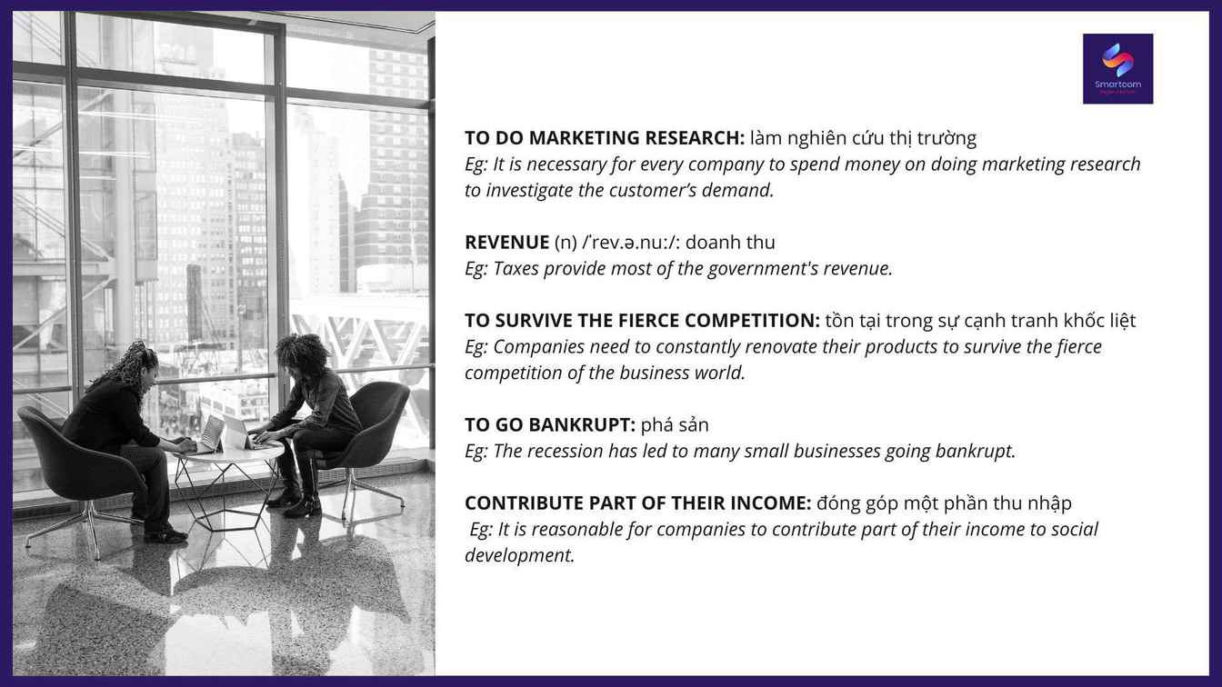 To do marketing research: làm nghiên cứu thị trườngEg: It is necessary for every company to spend money on doing marketing research to investigate the customer’s demand.(Mọi công ty đều cần phải chi tiền cho việc nghiên cứu tiếp thị để điều tra nhu cầu của khách hàng). Revenue (n) /ˈrev.ə.nuː/: doanh thuEg: Taxes provide most of the government's revenue.(Thuế cung cấp phần lớn doanh thu của chính phủ). To survive the fierce competition: tồn tại trong sự cạnh tranh khốc liệt Eg: Companies need to constantly renovate their products to survive the fierce competition of the business world.(Các công ty cần phải liên tục đổi mới sản phẩm của mình để tồn tại trong sự cạnh tranh khốc liệt của thế giới kinh doanh). To go bankrupt: phá sảnEg: The recession has led to many small businesses going bankrupt.(Suy thoái đã dẫn đến nhiều doanh nghiệp nhỏ bị phá sản). Contribute part of their income: đóng góp một phần thu nhập