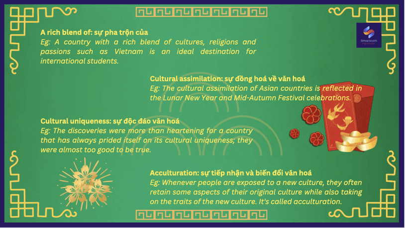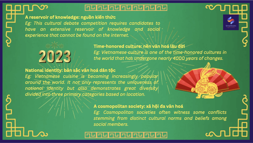 Đối với mỗi người con đất Việt, văn hoá và truyền thống của Việt Nam luôn là niềm tự hào và chúng ta coi việc giới thiệu văn hoá Việt đến bạn bè quốc tế là một niềm vinh hạnh để lan tỏa những giá trị văn hóa đáng trân trọng với năm châu bốn bể. Vậy ta lấy từ vựng về chủ đề văn hoá ở đâu để tự hào đây? Hmmm… ở đâu khó có Smartcom lo. Dưới đây là những cụm từ vựng giúp bạn thể hiện niềm tự hào văn hoá Việt.1. A rich blend of: sự pha trộn của Eg: A country with a rich blend of cultures, religions and passions such as Vietnam is an ideal destination for international students. (Một quốc gia với sự pha trộn độc đáo của các nền văn hoá, tôn giáo và niềm đam mê như Việt Nam là điểm đến lý tưởng cho sinh viên quốc tế.)2. Cultural assimilation: Sự đồng hoá về văn hoá Eg: The cultural assimilation of Asian countries is reflected in the Lunar New Year and Mid-Autumn Festival celebrations. (Sự đồng hoá về văn hoá của các nước Châu Á được thể hiện qua các phong tục ngày tết âm và ngày lễ trung thu.)3. Cultural uniqueness: Sự độc đáo văn hoá Eg: The discoveries were more than heartening for a country that has always prided itself on its cultural uniqueness; they were almost too good to be true. (Những khám phá này không chỉ là niềm vui cho một đất nước luôn tự hào về sự độc đáo văn hoá của mình; họ gần như quá tốt để trở thành sự thật.)4. Acculturation: Sự tiếp nhận và biến đổi văn hoá Eg: Whenever people are exposed to a new culture, they often retain some aspects of their original culture while also taking on the traits of the new culture. It's called acculturation. (Bất cứ khi nào mọi người tiếp nhận một nền văn hoá mới, họ thường giữ lại một số khía cạnh của nền văn hoá gốc của họ đồng thời tiếp nhận những đặc điểm của nền văn hoá mới. Đó được gọi là sự tiếp nhận và biến đổi văn hoá.) ielts-online-e-learning-culture 5. A reservoir of knowledge: Nguồn kiến thức Eg: This cultural debate competition requires candidates to have an extensive reservoir of knowledge and social experience that cannot be found on the internet. (Cuộc thi tranh luận về văn hóa này đòi hỏi các thí sinh phải có vốn kiến ​​thức và kinh nghiệm xã hội phong phú mà không thể tìm thấy trên mạng.)6. Time-honored culture: Nền văn hoá lâu đời Eg: Vietnamese culture is one of the time-honored cultures in the world that has undergone nearly 4000 years of changes. (Nền văn Việt Nam là một trong những nền văn hóa lâu đời nhất trên thế giới đã trải qua gần 4000 năm thay đổi.)7. National identity: Bản sắc văn hoá dân tộc Eg: Vietnamese cuisine is becoming increasingly popular around the world. It not only represents the uniqueness of national identity but also demonstrates great diversity divided into three primary categories based on location. (Ẩm thực Việt Nam ngày càng trở nên phổ biến trên toàn thế giới. Nó không chỉ thể hiện tính độc đáo của bản sắc dân tộc mà còn thể hiện sự đa dạng được chia thành ba loại chính dựa trên vùng miền.)8. A cosmopolitan society: Xã hội đa văn hoá Eg: Cosmopolitan societies often witness some conflicts stemming from distinct cultural norms and beliefs among social members. (Các xã hội quốc tế thường chứng kiến ​​một số xung đột xuất phát từ các chuẩn mực và niềm tin văn hóa khác biệt giữa các thành viên xã hội.) ielts-online-e-learning-culture